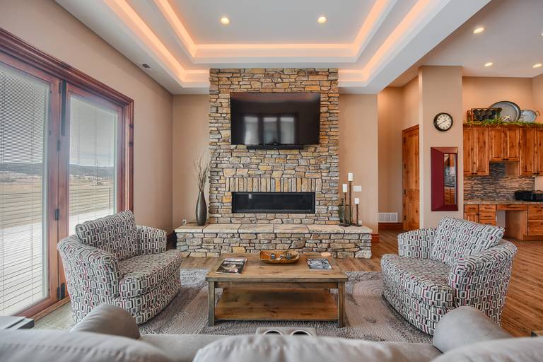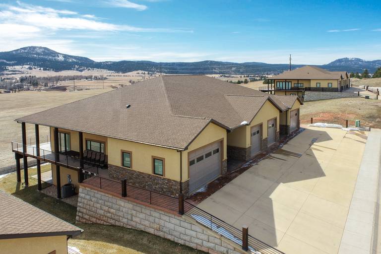 Step inside to an inviting open floor plan spanning two spacious levels, where floor-to-ceiling windows frame the panoramic beauty of the Black Hills. The gourmet kitchen is a chef’s dream, featuring top-tier appliances, custom cabinetry, and premium countertops—perfect for preparing meals to enjoy in the stylish dining area or out on the expansive deck with unparalleled views.