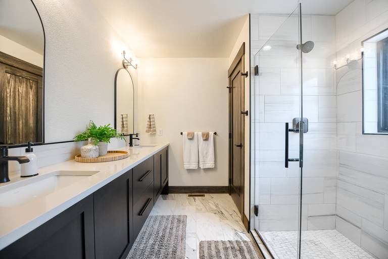 Bedroom 1 - Main Level - King Bed with ensuite bathroom, walk in shower and dual vanities