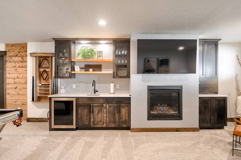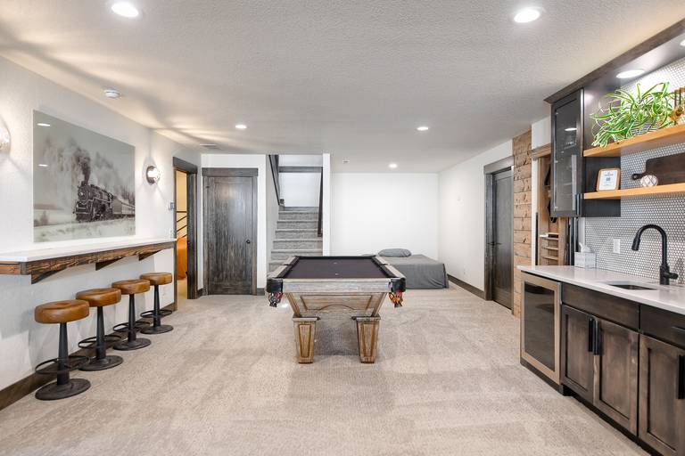 Step inside and prepare to be captivated by the open floor plan design, where the spaciousness creates a warm and inviting atmosphere. The open well-stocked kitchen provides a large island to sit around and enjoy your company, small appliances for cooking great meals, and a window-filled room to enjoy plenty of natural light. With five beautifully appointed bedrooms with all Tempur-Pedic mattresses and 4.5 bathrooms, this cabin can comfortably accommodate large groups or families seeking a memorable getaway. As you explore the property, you'll discover two cozy fireplaces that add a touch of elegance and provide a cozy ambiance during colder evenings. Whether you're gathering with loved ones or simply enjoying a quiet moment alone, these fireplaces create the perfect backdrop for relaxation and reflection. The custom bunk room is a perfect place for kids to enjoy 3 TVs. Bring a gaming console and hook them up to the wall of TVs and let them enjoy their space! The lower level also includes a great gathering space with a custom wooden counter with barstools, pool table, living room lounging area and TV.