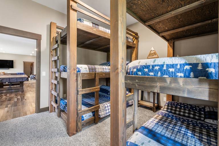 After your days of exploring and enjoying the wonderful scenery, coming home to your very own luxurious cabin is sure to build excitement. You'll enjoy the local wildlife that frequent the area, take in the magnificent starry night skies, or just lounge in the hot tub with your friends and family. There's plenty of space with 5,000 sq. ft spread across two floors and another 1,000 sq. ft in the heated 3-car garage! The open living/kitchen area, with 2 refrigerators, is perfect for gathering and enjoying your company, and also includes seating for up to 22 people comfortably in the dining area! The kitchen has all new appliances perfect for making meals in the comfort of the cabin, while the large living room includes expansive windows with incredible views of Terry Peak, Mystic Miner and the surrounding forest. There's also a fireplace and recliners to set the mood for rest and relaxation! There's a large deck off the main living area where you can take in the wonderful sound of breeze blowing through the ponderosa pines trees or start up the grill! The lower level includes an open concept bar area leading into a great entertaining room with a pool table, foosball, and a pac-man original game with over 2000 games loaded on it! There's also a patio off the lower level living area with a hot tub! You'll also love the convenience of having laundry on both floors of the cabin. There's 7 total bedrooms and enough beds to sleep 30 people! You can view the bed configuration in more detail below. Diamond in the Rough is sure to be a Black Hills experience you will never forget. It's the perfect cabin to bring your larger group and enjoy staying all in the same place, but have enough room to spread out and enjoy some rest and relaxation. We welcome you on your next Black Hills vacation.