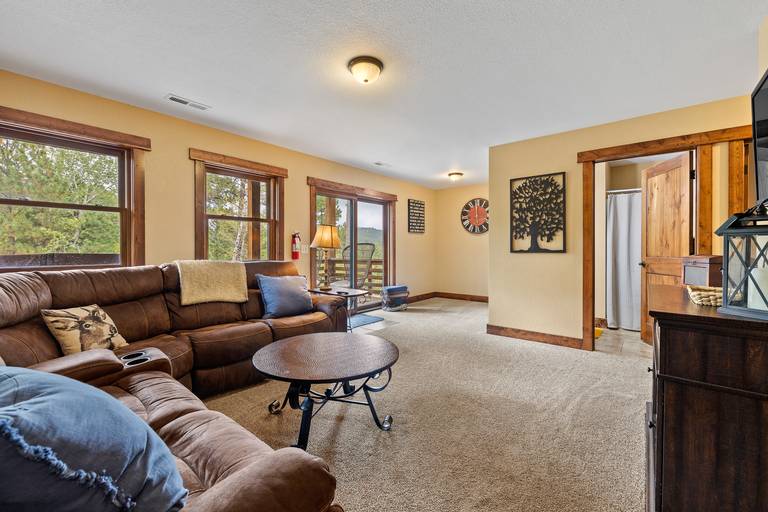 This beautiful custom-built Cabin has 3-Levels, 4 bedrooms and 2.5 bathrooms - perfect for those looking for some room to spread out, but still gather in the family room. It boasts an open kitchen/great room with gas fireplace, and flat screen TV with cable. There's a walk-out to the deck area from this great room to a covered private deck with gas grill and deck seating with a view. This main floor includes one bedroom with a queen bed and one bathroom. The loft includes a bedroom with a queen sized bed and half bath. The lower level of the home has a family room with a large sectional sofa, electric fireplace, flat screen TV with DVD, and access to the covered patio with secluded hot tub. There are also two bedrooms on the lower level - one with a queen bed, and the other with 2 full sized beds (as a bunk bed). The lower level also has it's own bathroom. Don't forget about the central A/C you'll enjoy on those warm summer days and a washer/dryer to clean off all your clothes from your days on the trails.