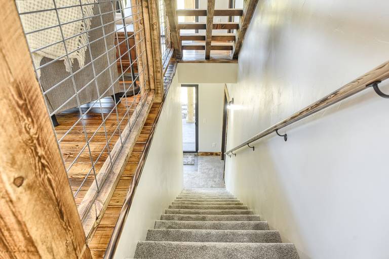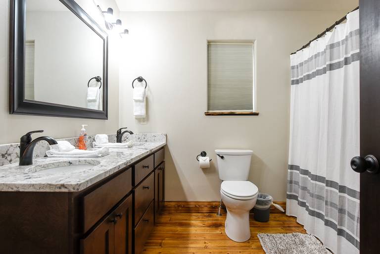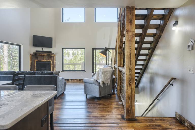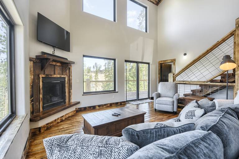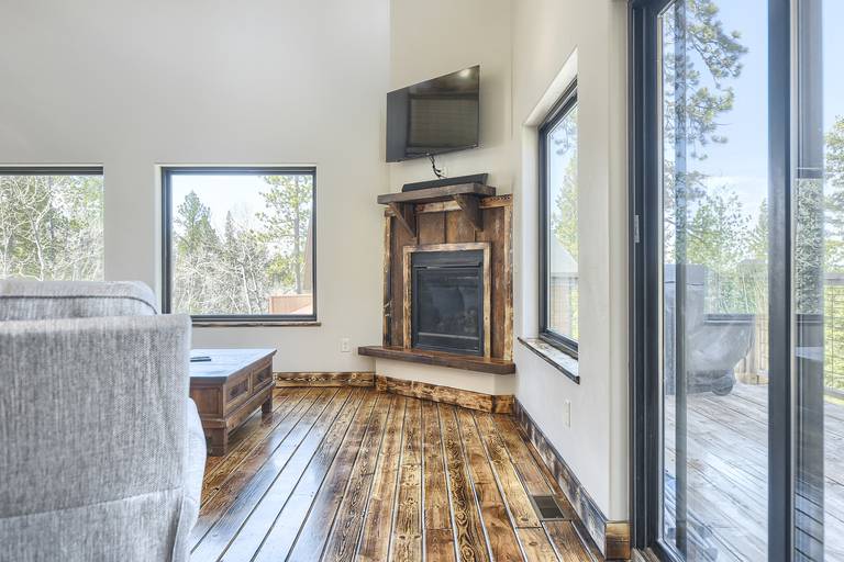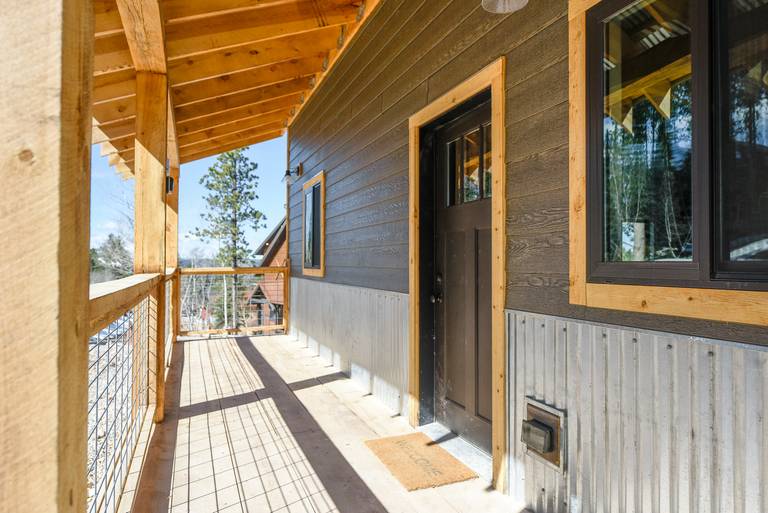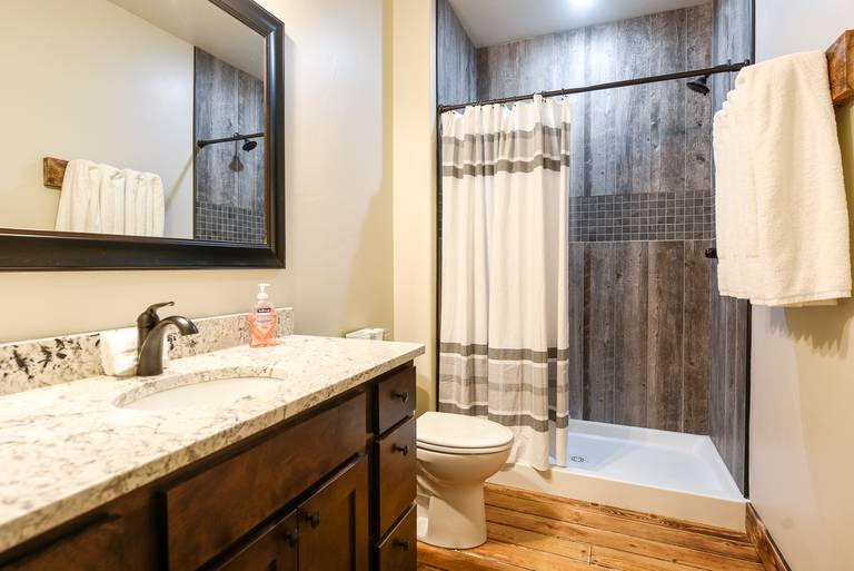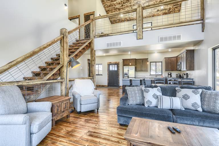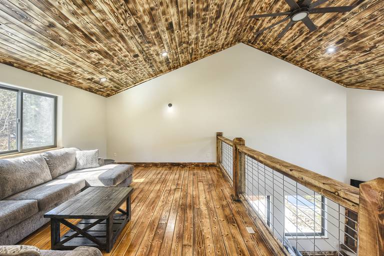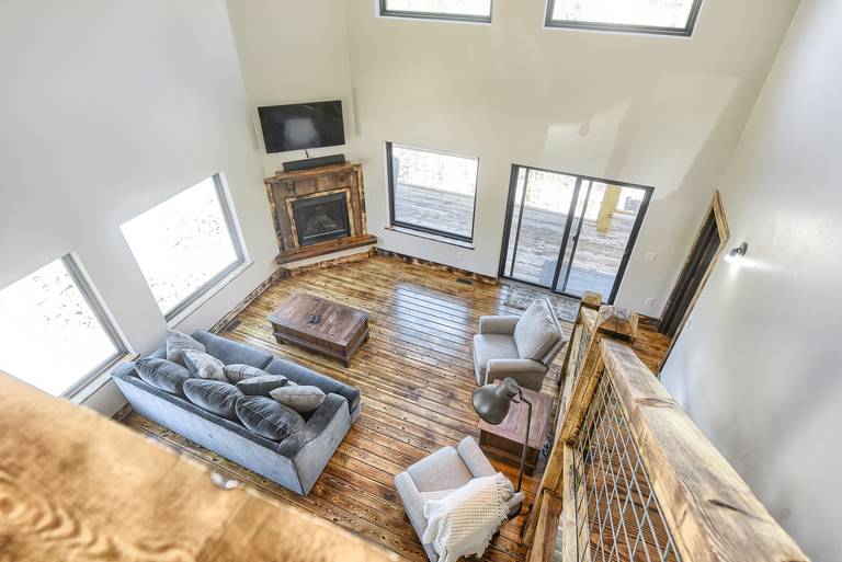 The cabin has been designed and built with your comfort and relaxation in mind. There's 2600 sq. ft of space on 3-levels making it great to spread out! The open floor plan on the main level great for entertaining with it's seamless kitchen/dining/living area. There's a gas fireplace as well, and it opens to the walk-out covered deck with a great view. The master bedroom is on the main level with a private bathroom, as well as a half bathroom off the kitchen. The upper level includes a comfy sectional couch in the loft, unique wood accented ceiling and another bedroom/bathroom. On the lower level, you'll love the living area with a TV, large sectional sofa, and a shuffleboard table. There's also 2 bedrooms on the lower level with built in bunk beds. The lower level has a walk out to the covered patio, where you'll enjoy the hot tub under the starry night skies.