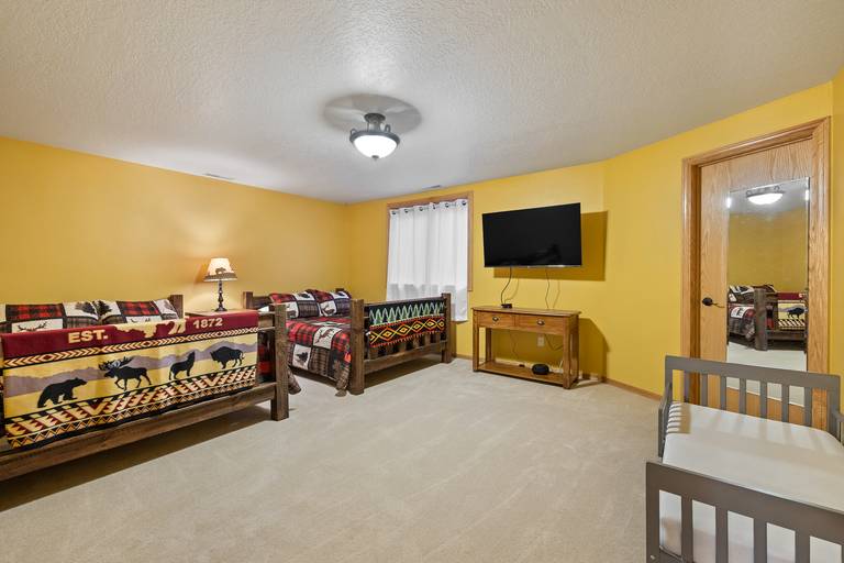 Bedroom 4 - Lower Level - 2 Queen beds, and 1 Toddler bed with shared bath + pack and play