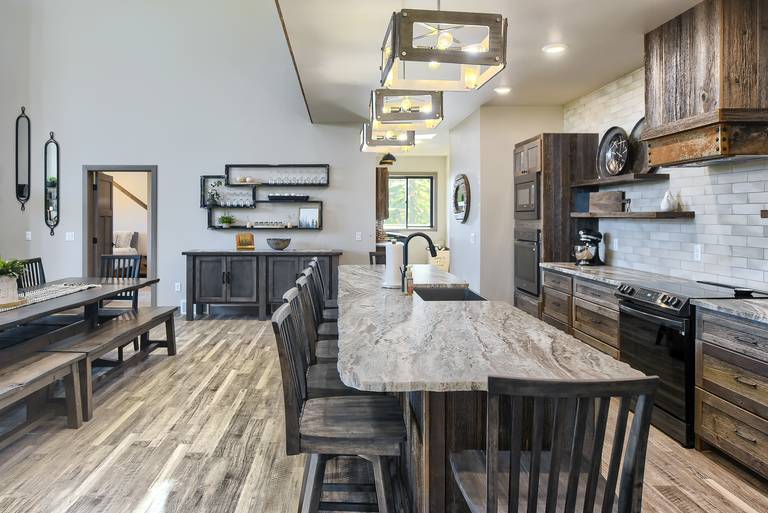This hand-crafted 5100 sq ft lodge features 6 bedrooms/ 5.5 bathrooms and sleeps 27. With an additional 1800 square feet of outdoor living space, there is room to gather together, or to spread out. Unique and spacious, this lodge boasts a giant great room with a two-story fireplace and ample comfortable seating, all in front of a massive bank of windows to enjoy the view of the Black Hills. You will love the spacious kitchen with plenty of room for everyone to gather with a 14-foot island and a 12-foot-long table! You’ll find all the amenities you