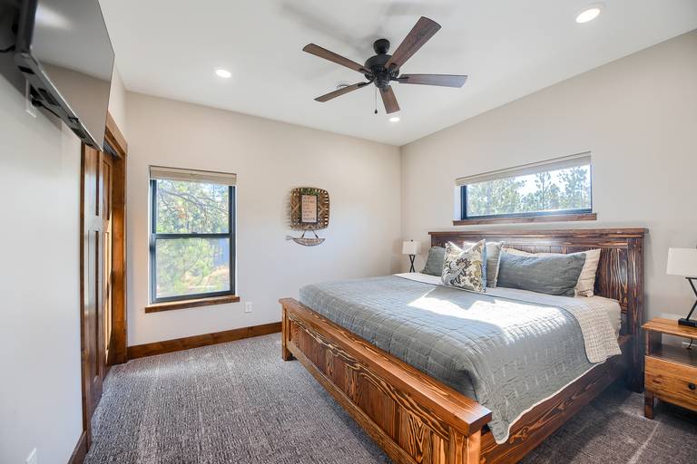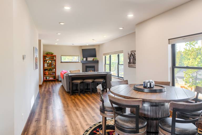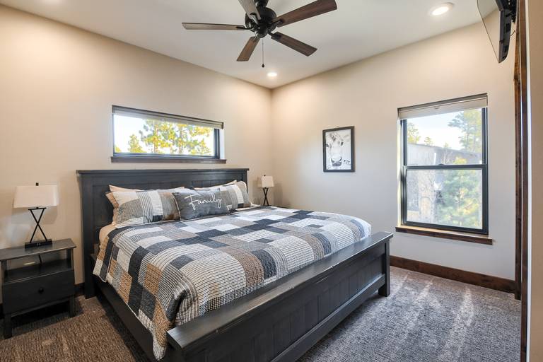 Reviewed on 2024-09-11 by Christine D. , Wentworth , SD United StatesWe loved this house. Two large common areas to hang out in. Four on suite bedrooms with an extra 1 1/2 baths. Bedrooms and baths were not very roomy, but each bedroom and common area had its own TV. Parking was a plus as we had 5 pickups with trailers with side by sides so plenty of room to park on both sides of this house. Kitchen was roomy and loved big dining table with plenty of counter seating. We used the outdoor fireplace and seating at night. Beautiful area, some houses are close together, but overall we loved this house.