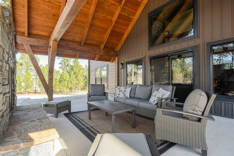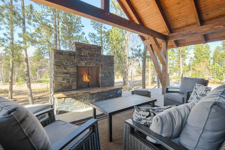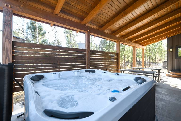 Step outside and discover the magic of the great outdoors in our custom-covered fireplace area, ideal for enjoying crisp evenings under the starlit sky. For the ultimate relaxation experience, immerse yourself in the covered hot tub, surrounded by the beauty of nature. You'll also love viewing the stars while in the covered hot tub with seating for up to 7!