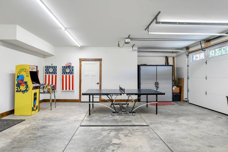 Entertainment awaits in the heated garage, where you'll find a variety of games, including ping pong, arcade games, and bean bag toss. Challenge your loved ones to friendly competitions or unwind after a day of exploration.