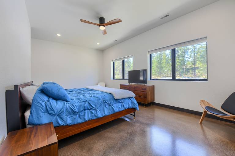 This house has a modern house with 3 bedrooms and 3 baths. We were there with 3 couples and each had their own bathroom and bedroom. The main bedroom area was large. The other 2 bedrooms were on the other end of the house and were smaller with queen beds. Bathrooms were all very nice. Open floor plan was great!<br/>We had plenty of space for us all. Had parking enough for 3 vehicles and trailers. The back covered patio with the gas fire pit was awesome!
