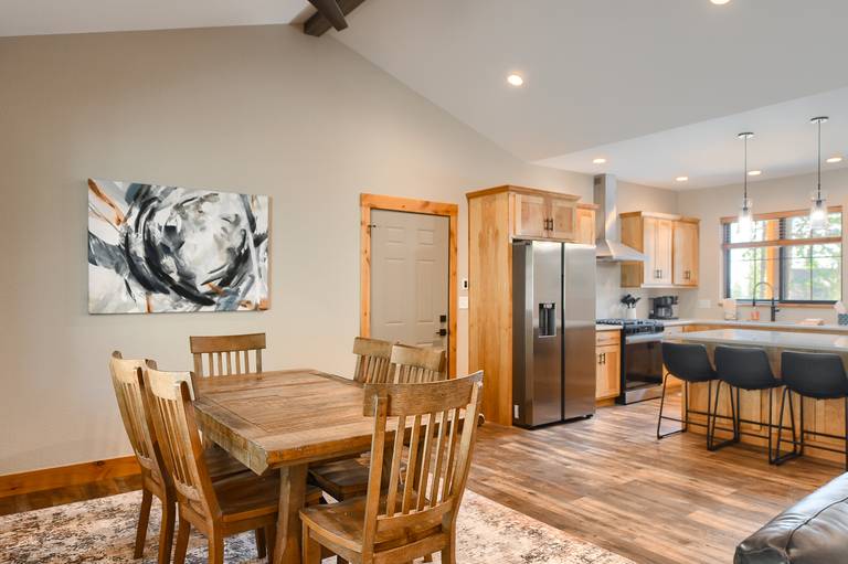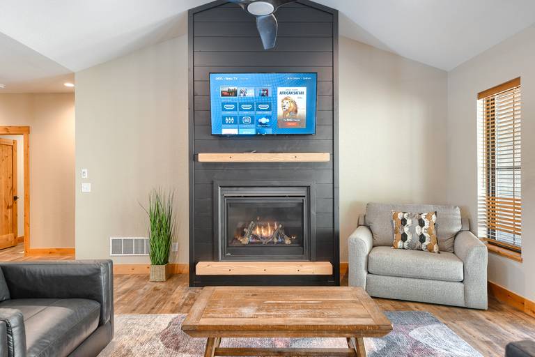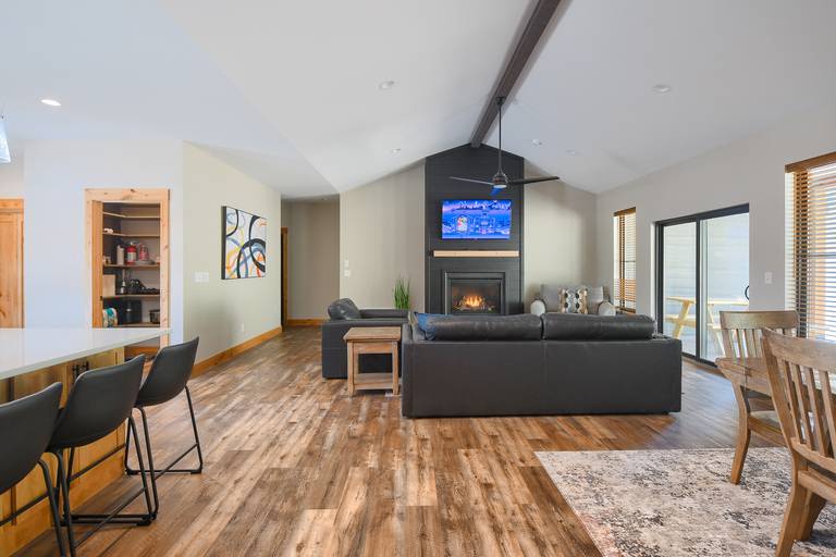 The living room features a cozy fireplace, perfect for warming up after a day of outdoor adventures. Stay connected with high-speed Starlink internet, whether you're working remotely or streaming your favorite shows. The well-equipped kitchen invites you to prepare delicious meals, which you can enjoy in the dining area or on the covered patio.