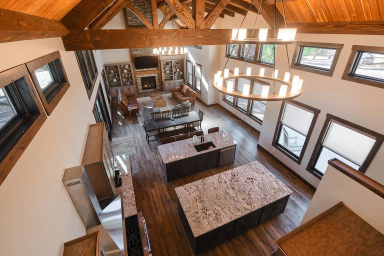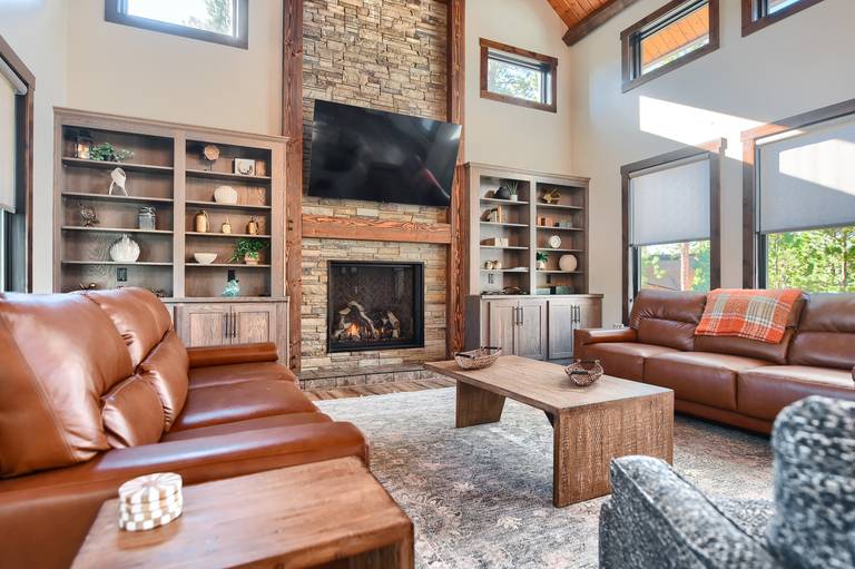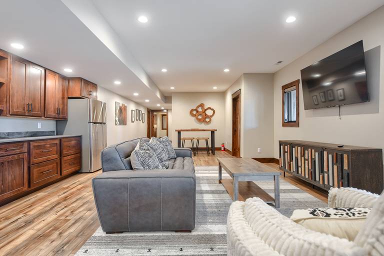 The main living area showcases an open floor plan, effortlessly connecting the kitchen, dining, and living spaces. Prepare meals in the well-stocked kitchen, equipped with premium stainless steel appliances, 2 large island's, and all the essentials for cooking and entertaining. The dining area is perfect for family meals or intimate dinners, while the living space features cozy seating and a beautiful fireplace — a great spot to relax after a day of exploring. There's a second large living area on the lower level as well great for watching movings or enjoying your family's company.