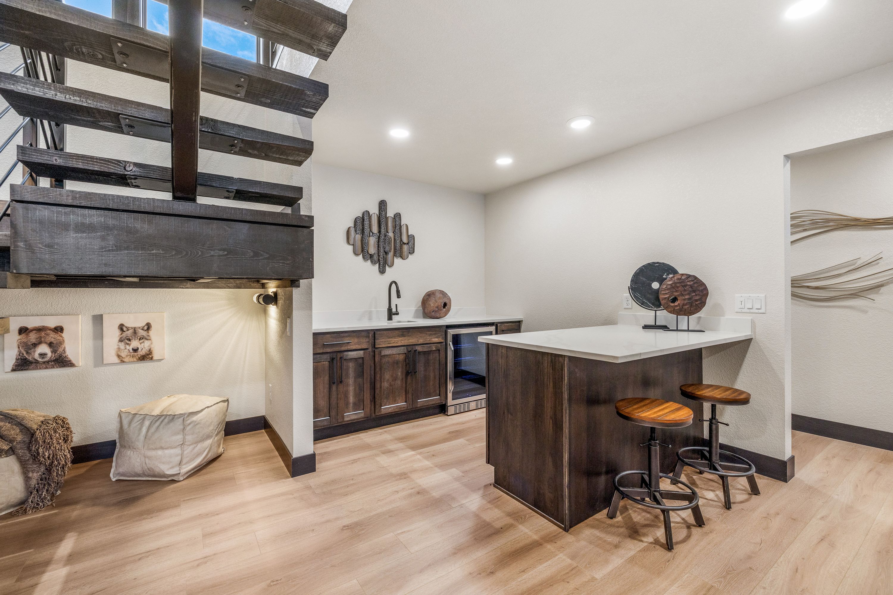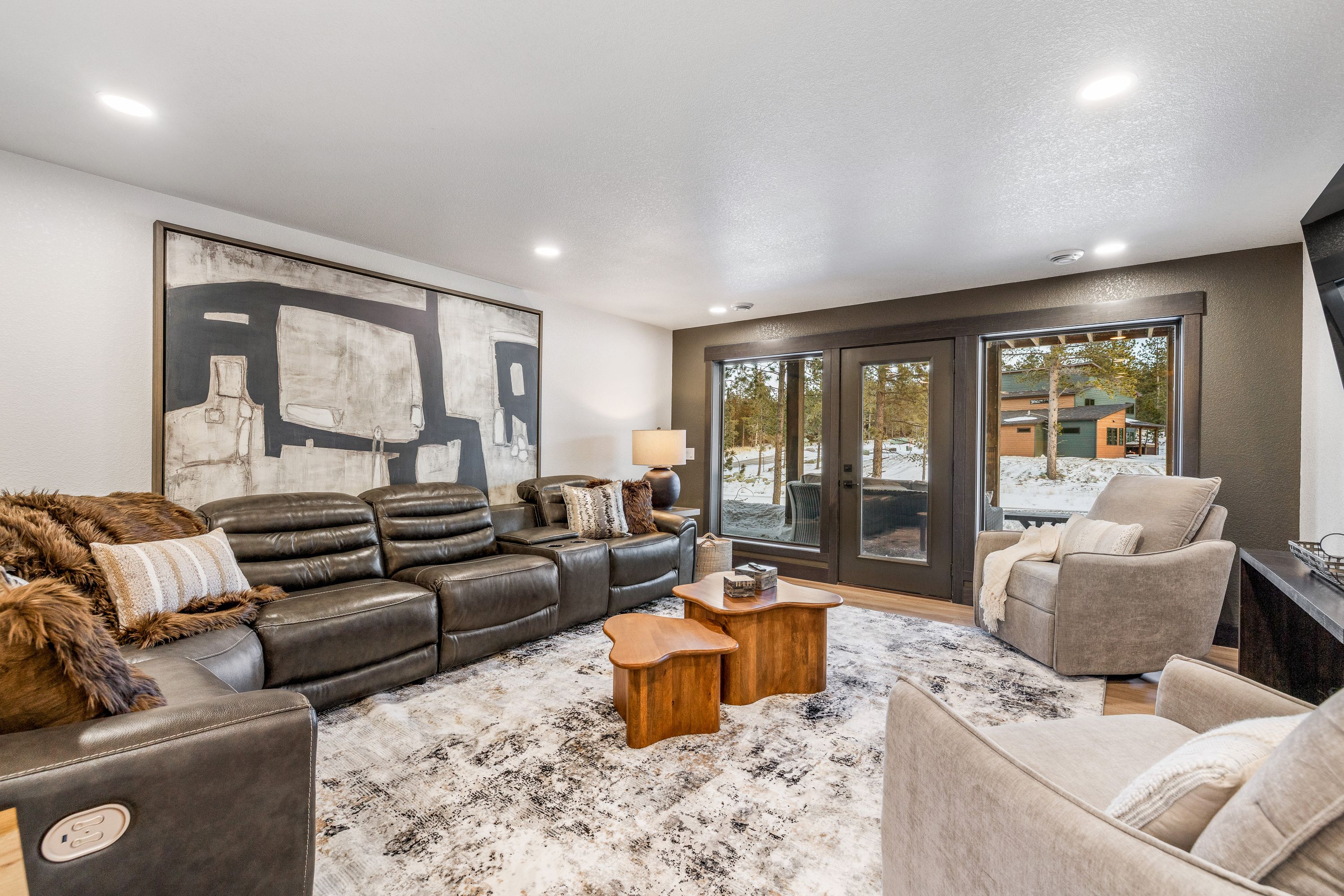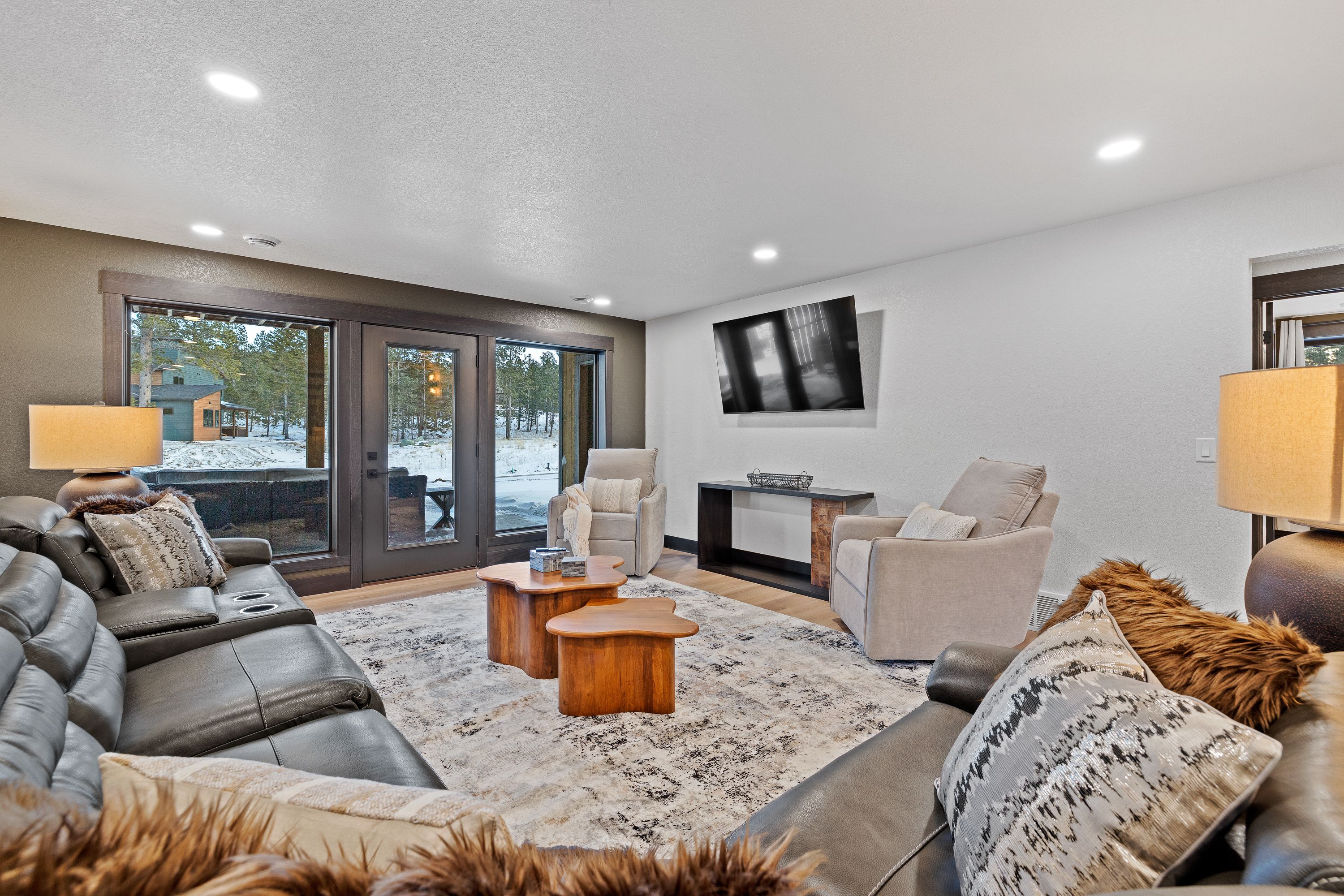 The lower level offers a second open living area complete with a mini bar, ideal for unwinding after a day on the trails. From here, walk out to a covered patio featuring comfortable seating and a spacious hot tub, perfect for soaking while surrounded by the peaceful forest setting.