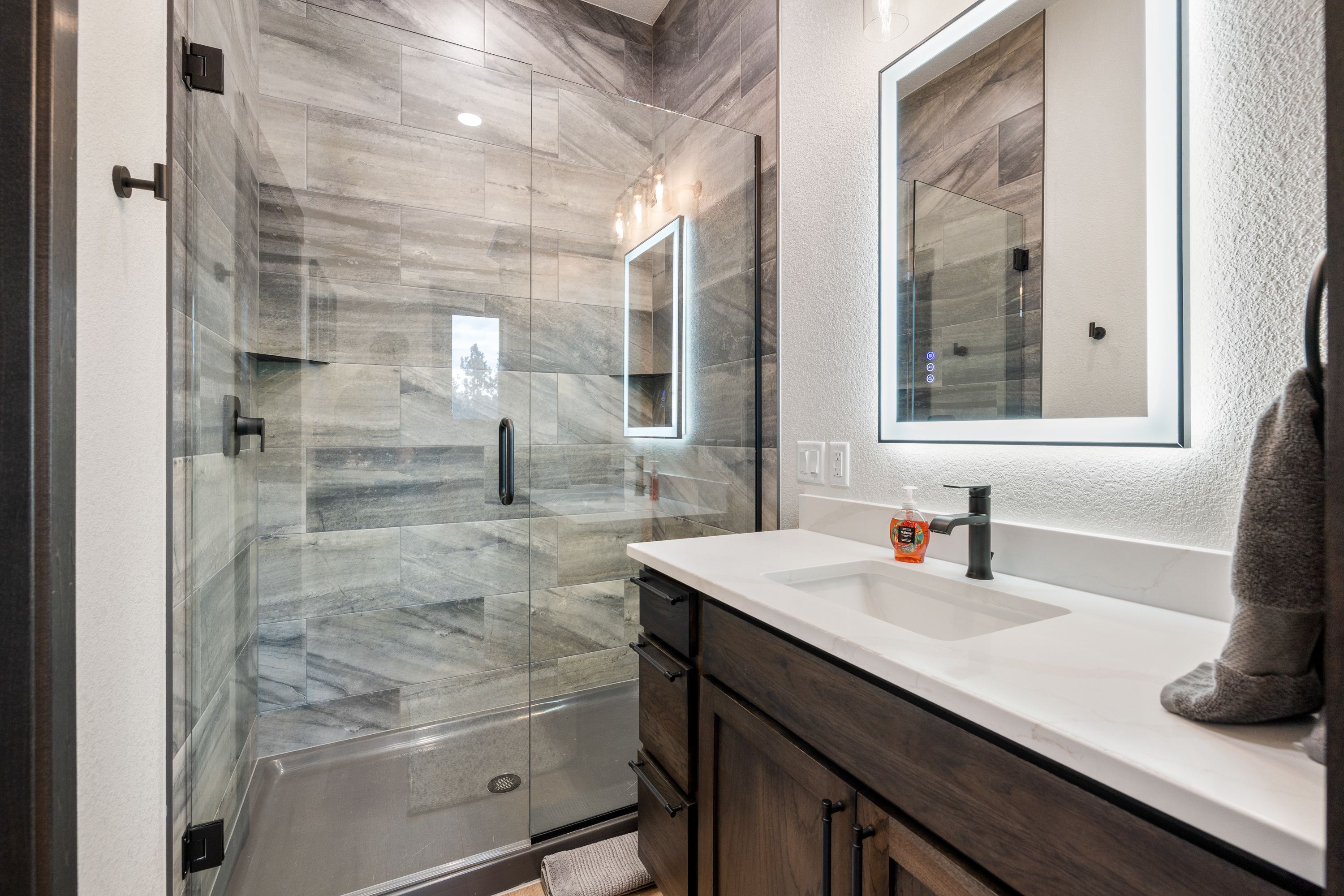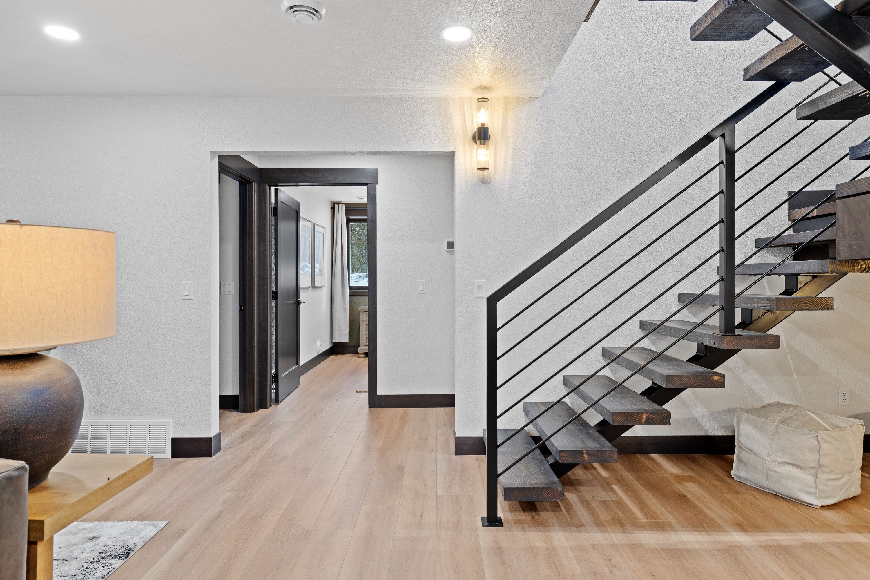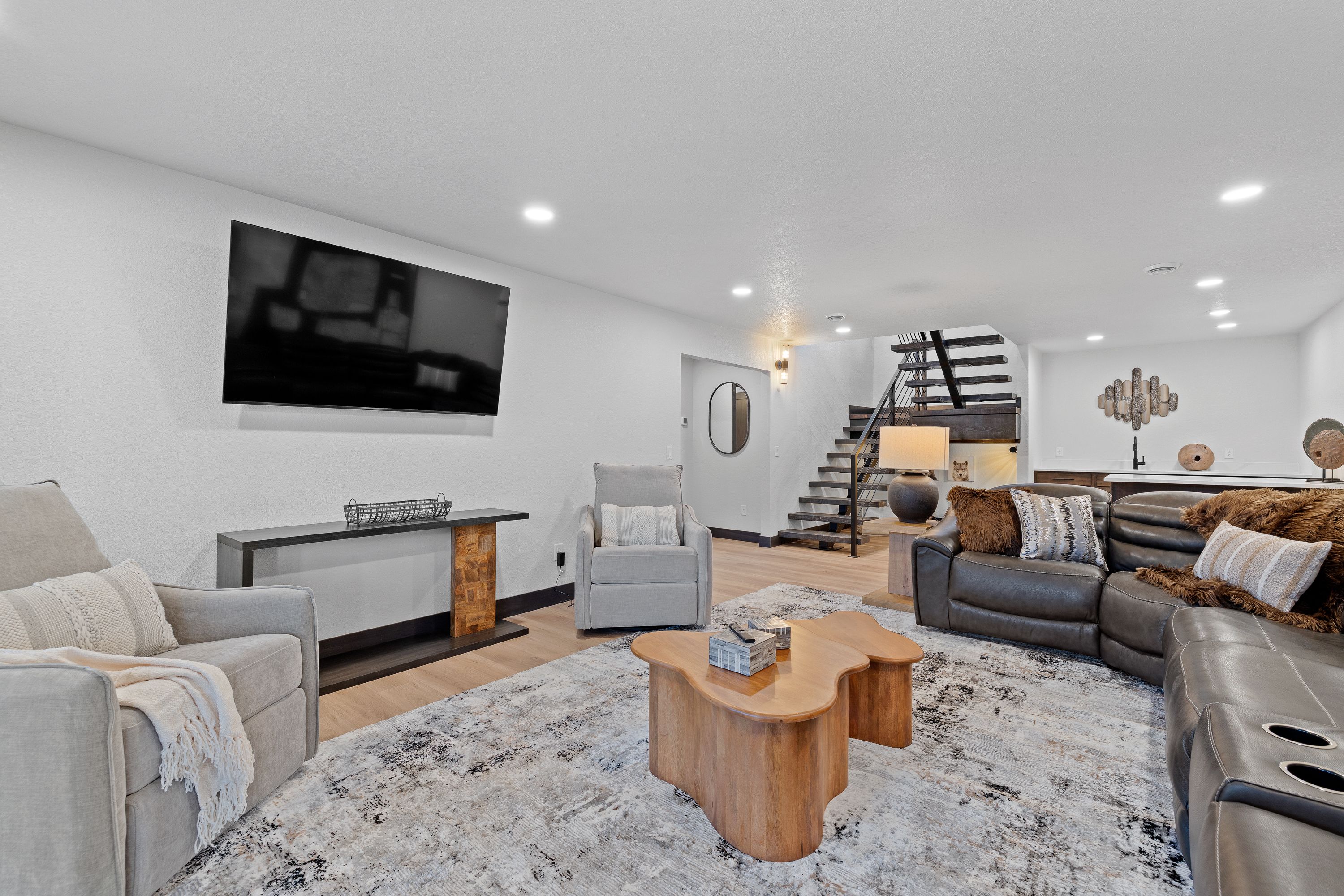 The lower level offers a second open living area complete with a mini bar, ideal for unwinding after a day on the trails. From here, walk out to a covered patio featuring comfortable seating and a spacious hot tub, perfect for soaking while surrounded by the peaceful forest setting.