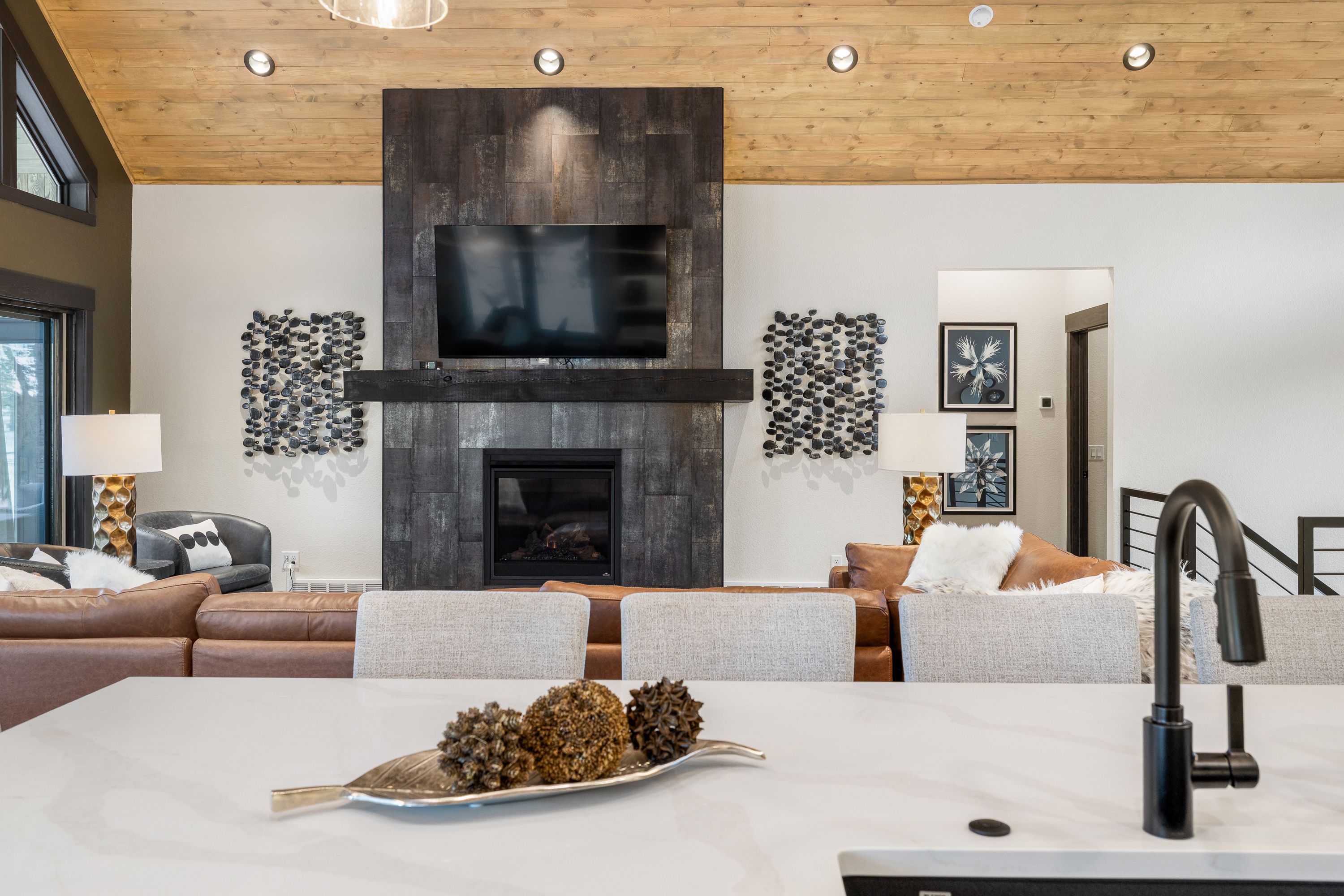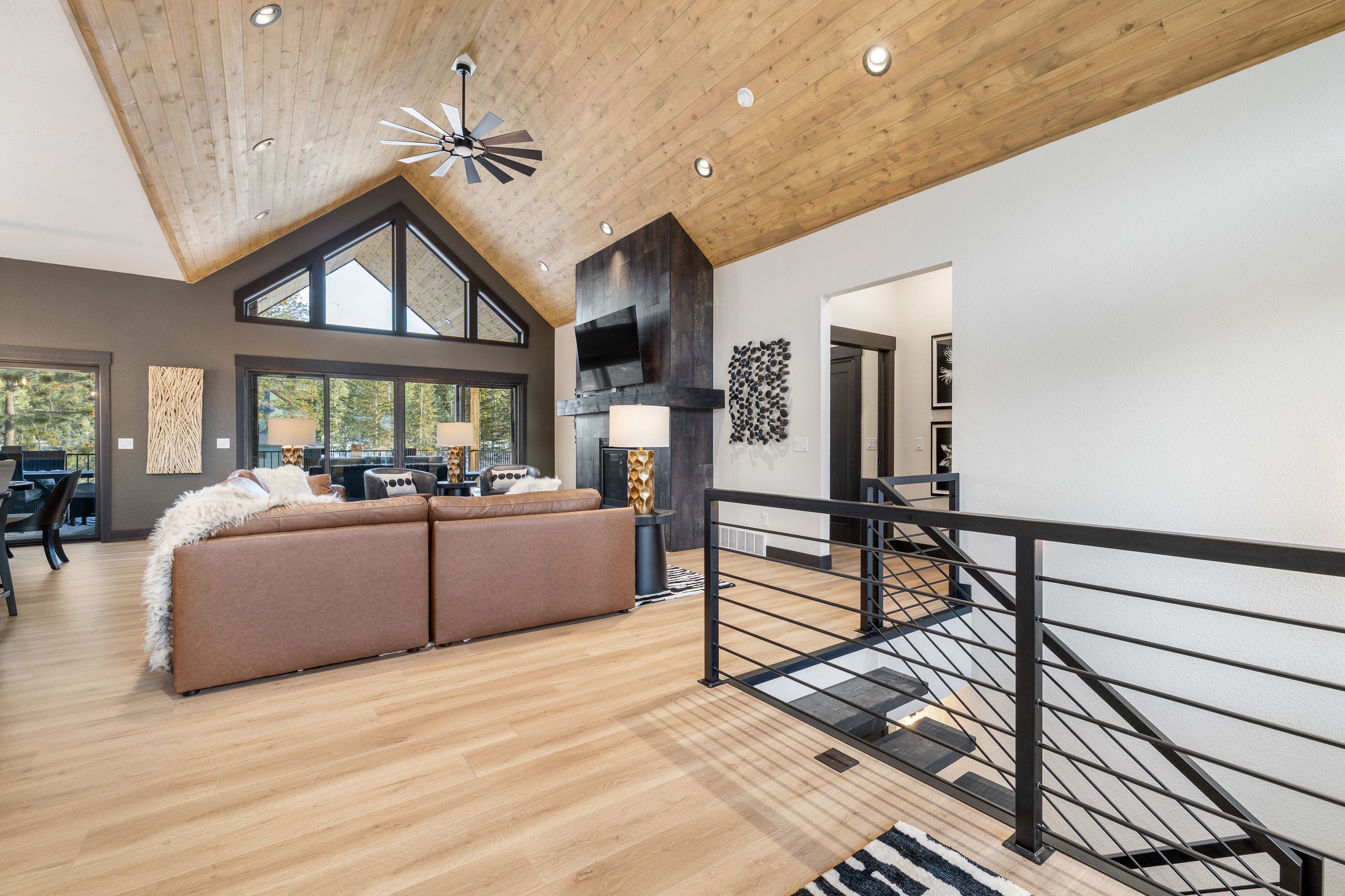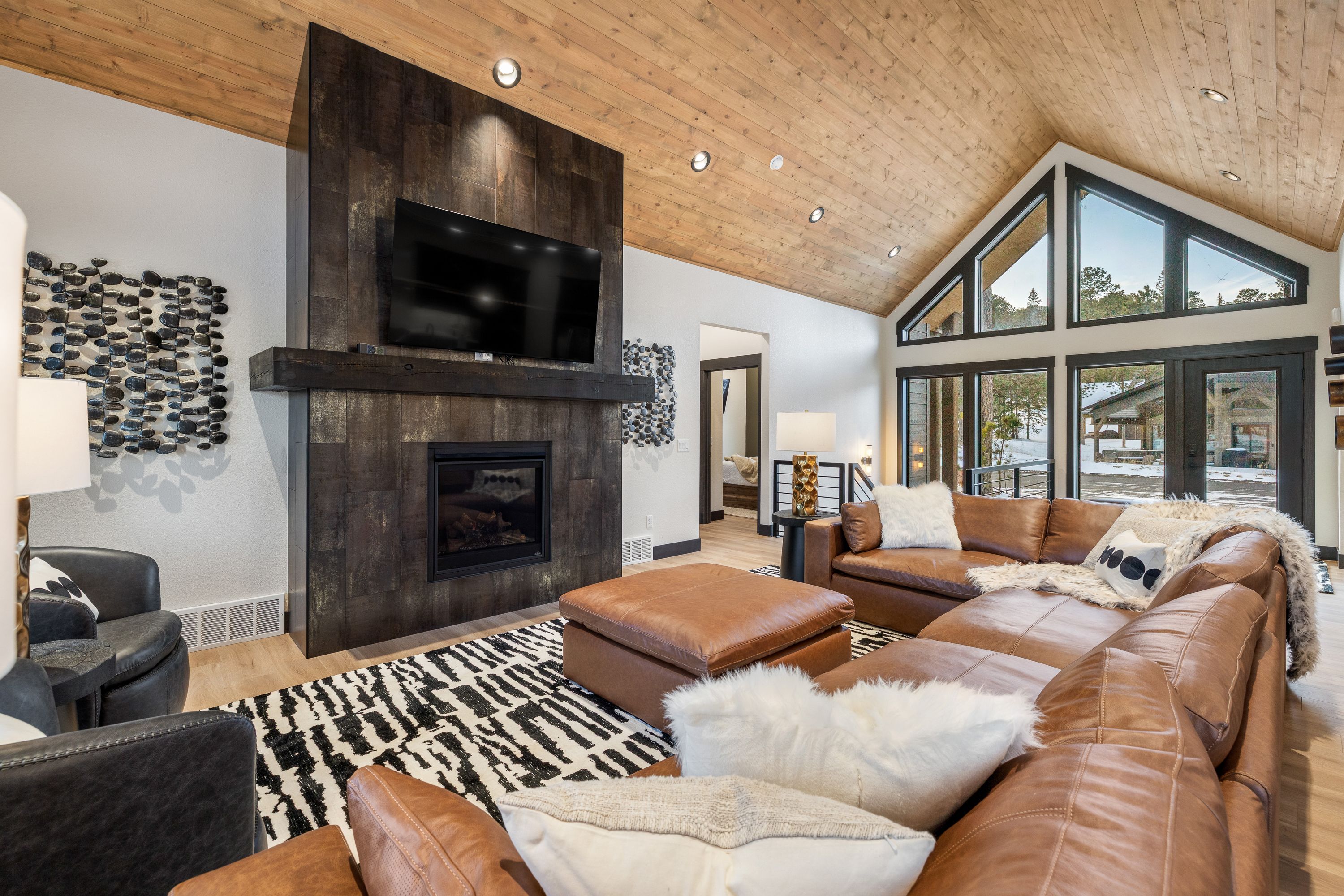 Designed with both comfort and style in mind, the home features five spacious master suites, each with its own private attached bathroom, giving every guest a true retreat of their own. The main level boasts an open-concept layout filled with natural light, expansive windows, a cozy fireplace, and high-end finishes throughout. Gather in the inviting living space or step outside onto the upper deck, where an outdoor fireplace creates the perfect setting for relaxing evenings under the mountain sky.
