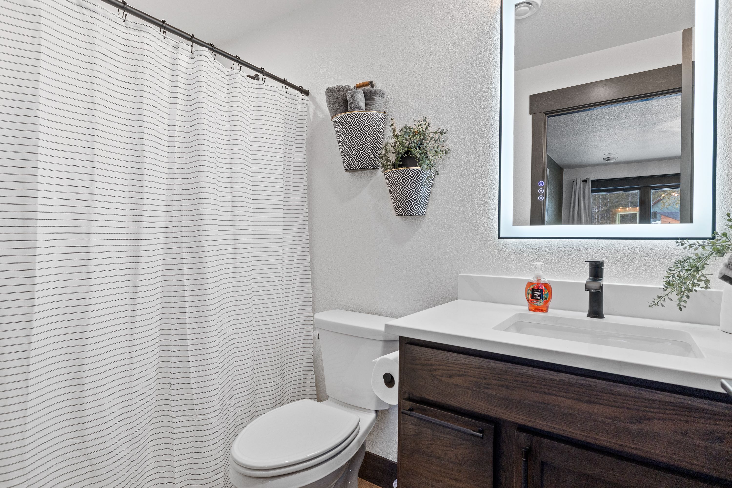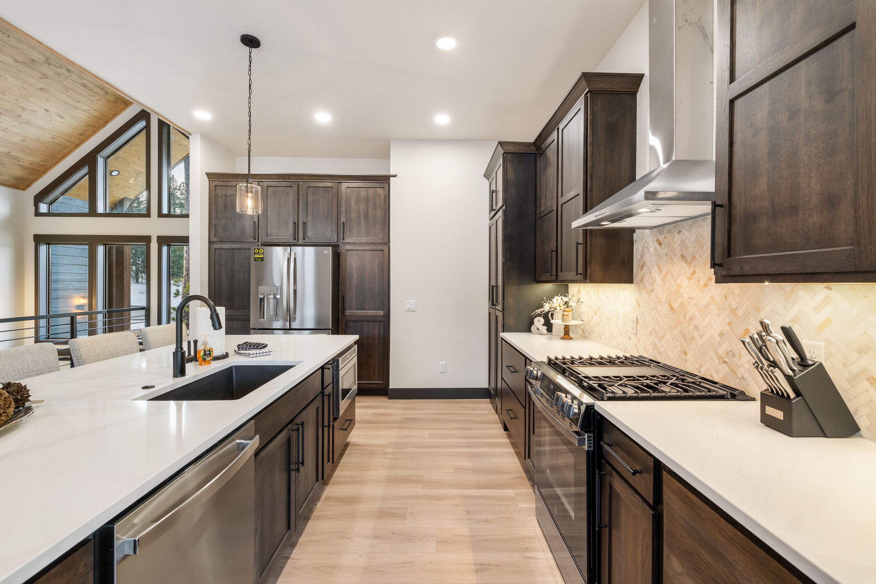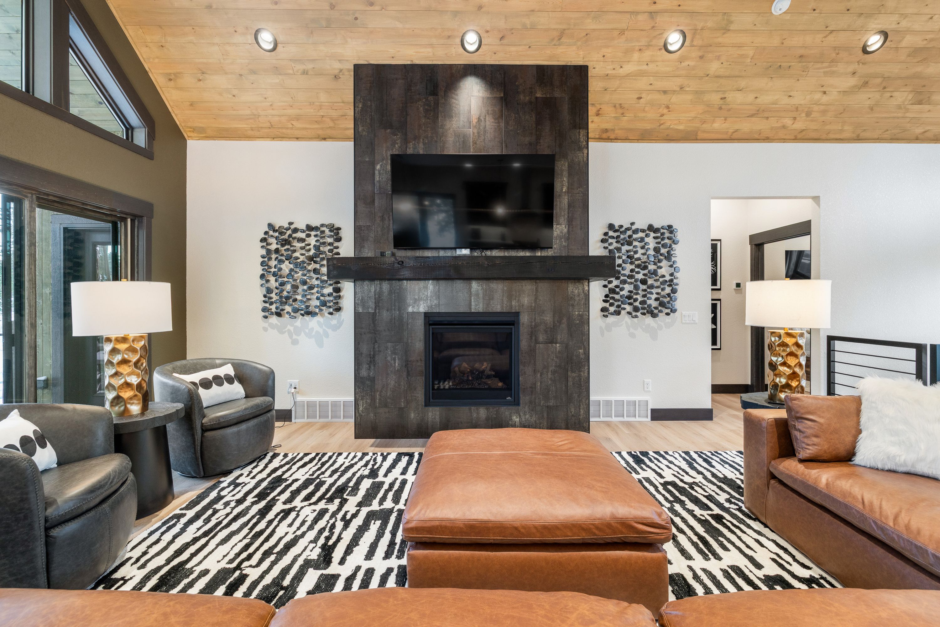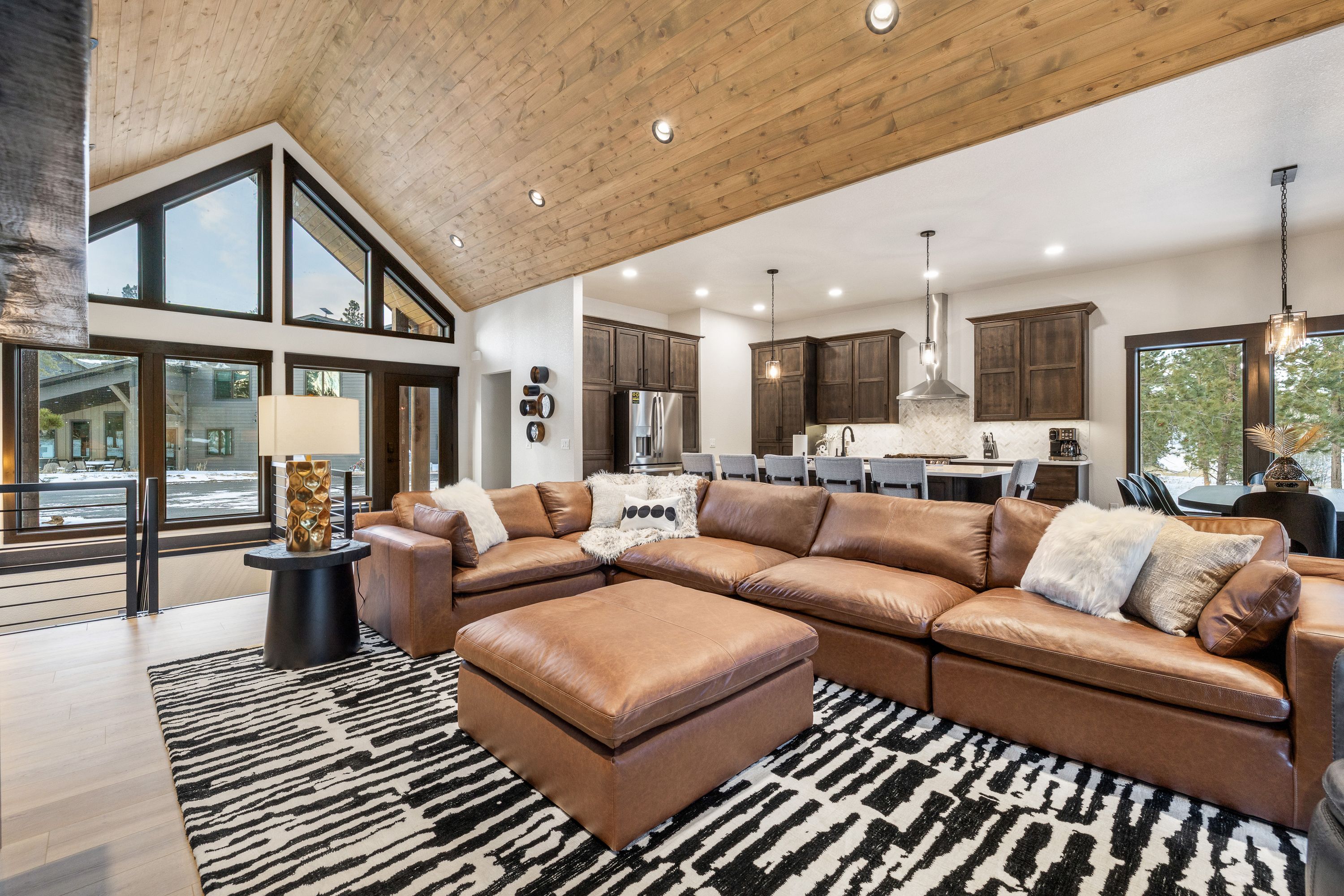 Designed with both comfort and style in mind, the home features five spacious master suites, each with its own private attached bathroom, giving every guest a true retreat of their own. The main level boasts an open-concept layout filled with natural light, expansive windows, a cozy fireplace, and high-end finishes throughout. Gather in the inviting living space or step outside onto the upper deck, where an outdoor fireplace creates the perfect setting for relaxing evenings under the mountain sky.